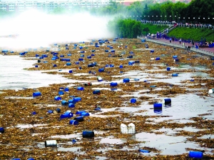 記者下午在吉林市城區(qū)內的一處松花江段看到,江面上漂浮著幾十個藍色的原料桶,江邊異常的氣味不太明顯。
