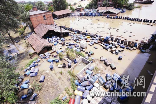 漢江長豐橋江段漢口一側一倉庫被淹,數百只化工鐵桶和塑料桶浸泡在江水中,另有數千只桶堆在江中的平臺上。昨日,記者聞訊立即向環(huán)保部門反映,東西湖區(qū)環(huán)保局連夜組織打撈。