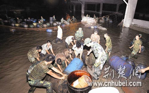 昨晚8時許,東西湖區(qū)環(huán)保局監(jiān)察大隊夏大隊長表示,接到反映后,下午立即展開了調查,發(fā)現部分桶內還有液態(tài)物質。東西湖區(qū)政府立即組織500多名民兵預備役人員,配合化工桶倉庫的業(yè)主,挑燈夜戰(zhàn)連續(xù)打撈和轉移,包括江中平臺上的化工桶在內,共3000只化工桶將不會在江中過夜;與此同時,區(qū)環(huán)保監(jiān)測站對桶內液態(tài)物質進行化驗,同時對浸泡化工桶的江水,每隔兩小時取一次樣進行化驗,密切監(jiān)測該江段的水質情況。