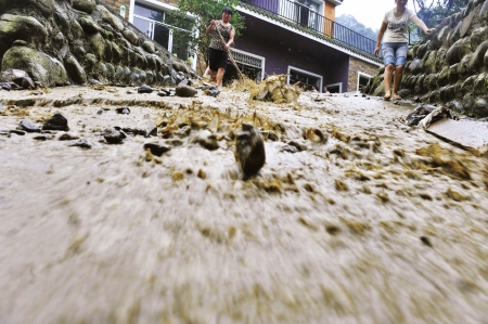 13日凌晨零點(diǎn)20分左右,都江堰上空突降暴雨,局部地區(qū)達(dá)到142毫米。強(qiáng)降雨造成都江堰城區(qū)和部分山區(qū)出現(xiàn)險(xiǎn)情,城區(qū)內(nèi)多處民房和街道被淹。部分板房安置區(qū)因提前備好抽水設(shè)備,積水短時(shí)間內(nèi)即被排出。都江堰水務(wù)局防汛辦主任張普龍說(shuō),這是近10年來(lái),都江堰短時(shí)最大強(qiáng)降雨。