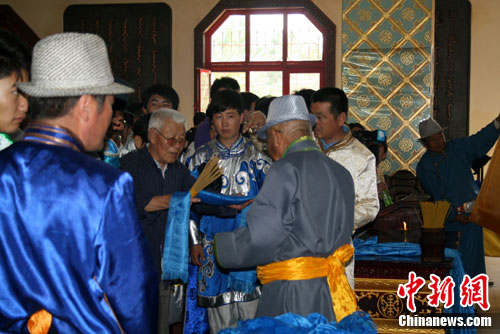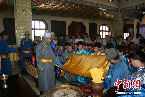 祈福儀式是在今天下午2時許開始的。在成吉思汗陵后殿供奉成吉思汗和夫人孛爾帖靈柩的靈包中,一位達(dá)爾扈特蒙古族老人手舉著延續(xù)將近800年不滅的長明燈,口誦禱文,為舟曲泥石流災(zāi)區(qū)人民祈福。