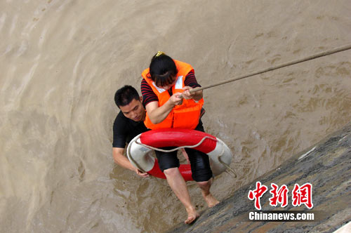 消防官兵搜尋到中攤堡大道,聽到中普建設(shè)楓香樹村安置房與中攤堡安置房交界處傳來求救聲音,利用強光手電筒發(fā)現(xiàn):洪水已將4名來不及疏散的施工人員團團包圍,工人在樓頂揮手、呼喊求救!安灰,我們馬上想辦法過來救你們”。由于水流很急且到處都是施工隊挖的暗溝,時間緊迫,消防站余柯政站長來不及多考慮,立即下令,將保險繩拴在消防車上,余站長和劉飛穿上救生衣,綁好安全繩后,帶著救生圈慢慢的游到被困群眾位置,將救生衣為民工穿好后,一邊由消防官兵護送一邊由在消防車一邊的其余消防官兵牽引安全繩接應(yīng),緊急轉(zhuǎn)移被困群眾。一趟、兩趟、三趟……經(jīng)過近半小時的奮戰(zhàn),成功救出被困工人。