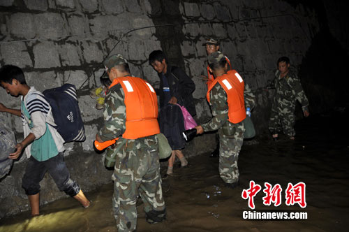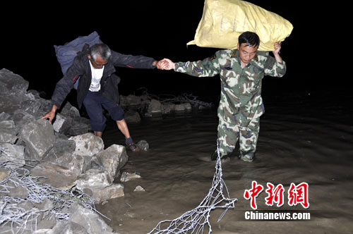 時間在一分一秒的過去,廖軍支隊(duì)長果斷下令,全體救援官兵穿著救生衣深入事故地段排成一條直線,由推土機(jī)的反斗將被困群眾載運(yùn)到臨時通道的安全地帶,隨即救援官兵通過攙扶、背負(fù)、肩扛等方式將被困群眾引導(dǎo)到河水上游的安全處。