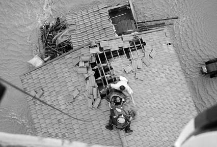 經過近兩個小時的飛行,B~7312救助直升機到達丹東機場中轉加油。此時傳來的消息是:洪水已經漲至齊腰深,4名群眾被困“孤島”。由于當地天氣突然變壞,潘偉隊長、副駕駛李春雨數次嘗試繞開雷雨區(qū),均未成功。直升機隨即返航。