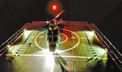 8月11日,南海某海域夜幕降臨,茫茫大海上,一架直升機向正在破浪行駛的某新型導彈驅(qū)逐艦飛近,平穩(wěn)地降落在甲板上。南海艦隊航空兵某飛行團某型艦載直升機成功進行夜間著艦訓練。