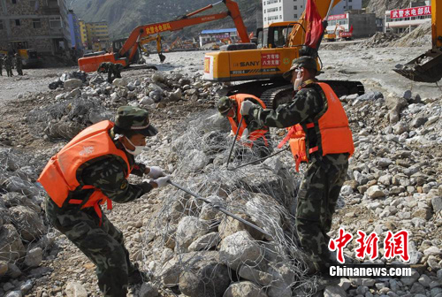 自8月8日以來,武警水電部隊500余名官兵和130余臺大型機械設備日夜連續(xù)奮戰(zhàn)在舟曲白龍江堰塞體搶險一線,他們采取“挖、裝、運”相結(jié)合、調(diào)運長臂反鏟深掏、人工安裝鐵絲籠固定護坡等作業(yè)方式,疏通河道,加快白龍江存水泄流速度,盡快消除洪水隱患。
