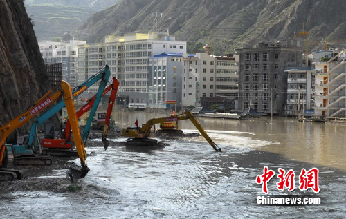 據(jù)了解,隨著瓦廠橋至城江橋長590米、深7米、寬24米的泄流渠被成功打通后,武警水電部隊在白龍江左右兩岸同時施工,加快了作業(yè)進度。白龍江8月26日水位與8月8日時相比已下降3 米多,舟曲縣濱河路的涼亭飛檐完全露出了水面。