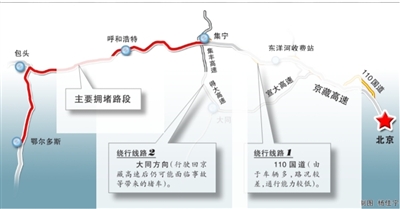 連日來,受大貨超載、車多、修路等因素影響,京藏高速重現(xiàn)大擁堵,上萬車輛滯留,內(nèi)蒙古境內(nèi)堵車路段更是長達(dá)120公里。與京外情況相比,110國道西關(guān)環(huán)島至延慶段的進(jìn)京和出京方向交通都較為通暢,未現(xiàn)擁堵現(xiàn)象。