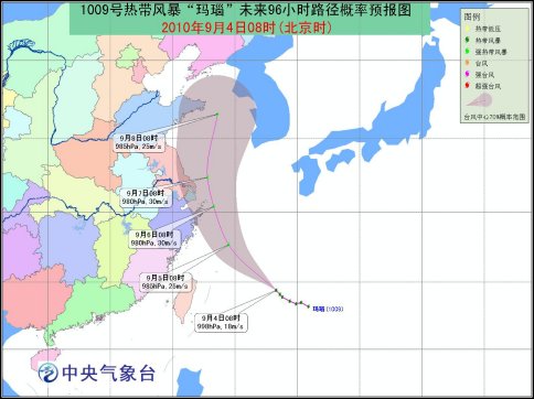 今年第9號(hào)熱帶風(fēng)暴“瑪瑙”于9月3日下午在西北太平洋洋面上生成,4日08時(shí)其中心位于浙江象山東南方大約860公里的洋面上,就是北緯24.4度,東經(jīng)128.3度,中心附近最大風(fēng)力有8級(jí)(18米/秒),中心最低氣壓998hPa。
