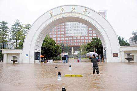 7時(shí)20分,在暨南大學(xué)正門,看到水已經(jīng)浸到了黃埔大道路邊直至,水勢最深處約有40厘米,學(xué)生撐著傘在水中緩緩前行。暨大的門衛(wèi)表示,今次雖然水浸,但是地下車庫并沒有受淹。