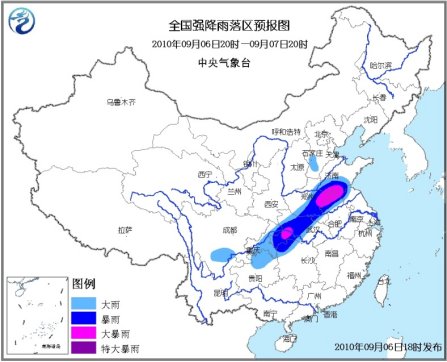 9月6日20時(shí)到7日20時(shí),山東中南部、安徽北部、江蘇北部、河南東部和南部、湖北中西部、重慶中東部、貴州北部、湖南西北部以及川西高原東南部、河北西南部等地有大雨或暴雨,其中,湖北西南部、河南中部偏東地區(qū)、山東西南部、安徽北部、江蘇西北部等地局部有大暴雨;上述部分地區(qū)并伴有短時(shí)雷雨大風(fēng)等強(qiáng)對流天氣。