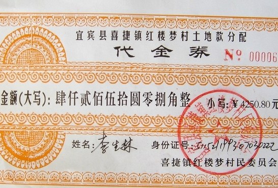 四川宜賓喜捷鎮(zhèn)紅樓夢村的村民近日向中國之聲反映,當地村委會把多年來拖欠農民的400萬元土地款印成了精美的代金券,替代人民幣發(fā)給了農民。這些代金券可以在本村內轉讓、贈予,還可以繼承。但如果想換成真錢卻要等到60多歲。記者調查發(fā)現,400萬代金券的背后,還隱藏著更大的玄機。