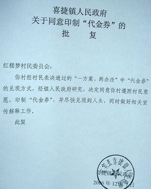 那么,村委會私自印制發(fā)行代金券的行為是否合法呢?面對記者的追問,三位村官都以沉默作答。再三追問之下,他們出示了當地鎮(zhèn)政府對此做過的批示。批示上蓋有宜賓縣喜捷鎮(zhèn)人民政府的公章。批復中寫道,經鎮(zhèn)人民政府研究,決定同意你村印制代金券。