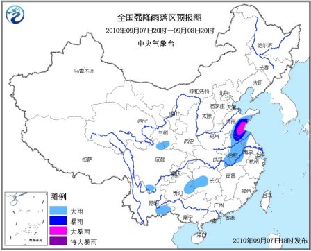 中新網(wǎng)9月7日電 據(jù)中央氣象臺(tái)網(wǎng)站消息,中央氣象臺(tái)9月7日18時(shí)繼續(xù)發(fā)布暴雨藍(lán)色預(yù)警:9月7日20時(shí)到8日20時(shí),山東中南部、安徽大部、江蘇北部和西部、湖北東部、湖南中部偏西地區(qū)、貴州東部、甘肅東南部、川西高原北部、云南東南部等地有大雨或暴雨,其中,山東東南部和江蘇北部的局部地區(qū)有大暴雨;上述部分地區(qū)并伴有短時(shí)雷雨大風(fēng)等強(qiáng)對(duì)流天氣。