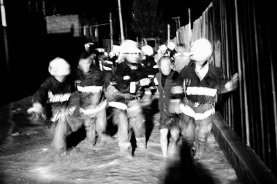 22時(shí)45分,所調(diào)集的東崗中隊(duì)一臺(tái)照明車正趕往現(xiàn)場(chǎng)。23時(shí)33分,特勤一中隊(duì)7名戰(zhàn)斗員到達(dá)現(xiàn)場(chǎng)。由于道路房屋都被泥水淹沒,給救援工作帶來了很大的困難。官兵們手抓大繩,走在齊腰深的淤泥中,一步一步到達(dá)現(xiàn)場(chǎng)后,發(fā)現(xiàn)多名群眾被困在房里面。時(shí)間就是生命!中隊(duì)長周暉立即命令一中隊(duì)官兵迅速展開救援,由于泥水淹至膝蓋,所有官兵只能緩慢的靠近被困群眾,然后一個(gè)個(gè)攙扶的進(jìn)行轉(zhuǎn)移。