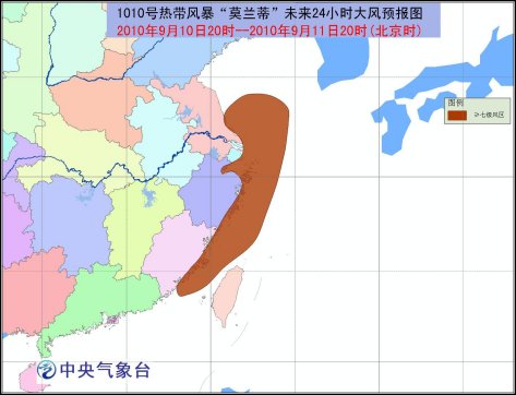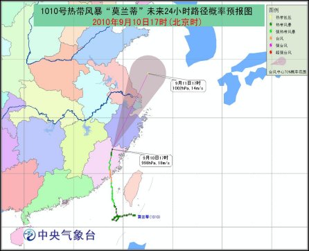 受“莫蘭蒂”、西南季風(fēng)和冷空氣的共同影響,9月10日20時(shí)到11日20時(shí),臺(tái)灣海峽、東海西部海面、臺(tái)灣沿海、福建沿海、浙江沿海、杭州灣、長(zhǎng)江口區(qū)有7-8級(jí)大風(fēng),陣風(fēng)可達(dá)9-10級(jí);江蘇東部和南部、上海、安徽東南部、浙江大部、江西東北部和東南部、福建西北部和南部、廣東大部、廣西南部、海南中北部等地有大雨或暴雨,局地有大暴雨。