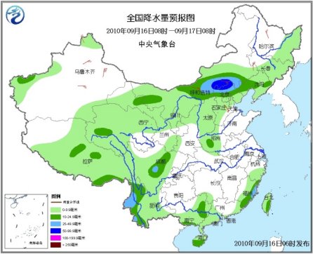 中新網(wǎng)9月16日電 據(jù)中央氣象臺(tái)預(yù)報(bào),未來三天,新疆西部、青海、西藏中東部和南部、西北地區(qū)中東部、內(nèi)蒙古大部、東北大部、華北、云南、四川等地有小到中雨或陣雨天氣,其中,內(nèi)蒙古中部偏南地區(qū)、華北中北部、云南西部、遼寧及臺(tái)灣東部等地的部分地區(qū)有大雨,局地有暴雨,上述地區(qū)局部并伴有短時(shí)雷雨大風(fēng)或冰雹等強(qiáng)對流天氣。