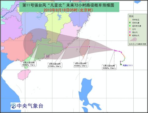 中新網(wǎng)9月18日電 中央氣象臺(tái)18日8時(shí)發(fā)布消息稱(chēng),今天,第11號(hào)強(qiáng)臺(tái)風(fēng)“凡亞比”將以每小時(shí)15~20公里的速度向臺(tái)灣沿海進(jìn)發(fā),強(qiáng)度繼續(xù)加強(qiáng),可能發(fā)展為超強(qiáng)臺(tái)風(fēng)。受其影響,臺(tái)灣和東南沿海將遭遇狂風(fēng)暴雨。中央氣象臺(tái)6時(shí)已經(jīng)發(fā)布臺(tái)風(fēng)紅色預(yù)警。