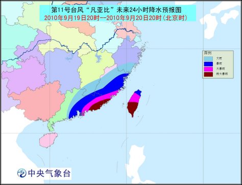 受其影響,未來24小時,東海南部、臺灣以東洋面、臺灣海峽、巴士海峽、巴林塘海峽、南海東北部、浙江南部沿海、臺灣及其沿海、福建沿海、廣東中東部沿海將有7-9級大風,其中福建中南部沿海、廣東東部沿海、臺灣海峽的部分海面或地區(qū)風力可達10-11級,“凡亞比”中心經(jīng)過的附近海面或地區(qū)的風力有12-13級;福建大部、浙江南部、江西東南部、廣東中東部、臺灣等地將有大到暴雨,其中福建東南部、廣東東部、臺灣等地的部分地區(qū)有大暴雨,局地有特大暴雨。中央氣象臺已于今日18時發(fā)布了暴雨藍色預警。