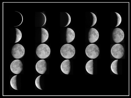 月球位于日、地之間時(shí)叫做“朔”,月球暗的半個(gè)球朝向地球,我們看不到它。朔之后的一兩天,鐮刀狀的新月在傍晚西方的天空中露面,凸面向著落日的方向。以后月球相對(duì)于太陽逐漸向東移動(dòng),亮的部分日益擴(kuò)展。五六天以后成了半圓形,這時(shí)的月相稱為“上弦”,日落時(shí)月球在天子午線附近。再經(jīng)過7天,便到了“望”(滿月),月球與太陽遙遙相望,我們看到的是一輪明月于傍晚東升,在晨曦中西落,將黑夜照耀得如同白晝一般。滿月以后,圓輪的西部日益虧缺。到“下弦”時(shí),呈半圓形,月球到半夜才升起。和上弦月相反,下弦月是東邊半個(gè)圓被照亮。下弦以后,半圓繼續(xù)虧缺,成為黎明前掛在東方天空的一絲殘?jiān)。它愈來愈接近太陽,終于跑到和太陽相同的方向,朔又來臨了。