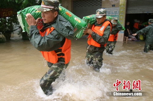 6日8時(shí)10分,瓊海市嘉積鎮(zhèn)橋頭村、塔洋鎮(zhèn)、中原鎮(zhèn)等地區(qū)被洪水淹沒(méi),4500名村民生命危在旦夕。武警一支隊(duì)接到命令后,立即組織200多名官兵,在總隊(duì)副參謀長(zhǎng)宮鐵芳,一支隊(duì)政委肖方明,參謀長(zhǎng)卓世武的率領(lǐng)下,分乘6輛大卡車,攜帶編織袋、救生艇23臺(tái)(艇)、救生衣、鐵鍬、鋤頭火速奔赴抗洪一線,疏散、轉(zhuǎn)移、搶救受災(zāi)群眾,打撈被淹貴重物資。