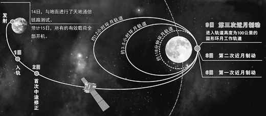 10月9日11時32分,嫦娥二號衛(wèi)星成功實施第三次近月制動,順利進入軌道高度為100公里的圓形環(huán)月工作軌道。按照預(yù)定計劃,嫦娥二號衛(wèi)星上搭載的有效載荷陸續(xù)開始工作,進行科學探測活動。