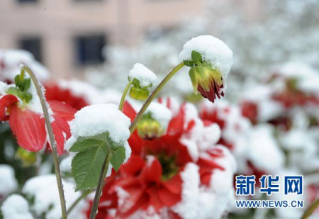 16日凌晨3時(shí)左右,黑龍江省大慶市及其周邊市縣開始降雪,至5時(shí)左右,大雪飛揚(yáng),車上、房頂和部分路段已積起了一層雪。由于近期大慶市氣溫并不低,樹葉都是綠色,突然降下的白雪蓋在綠樹上,顯得格外漂亮。