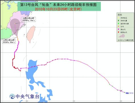 該預警指出,今年第13號強臺風“鲇魚”已于10月22日21時在南海東北部海面減弱為臺風,23日5時其中心位于福建省廈門市偏南方約150公里的臺灣海峽南部海面上,就是北緯23.1度,東經(jīng)118.1度,中心附近最大風力有13級(40米/秒),中心最低氣壓為965百帕。