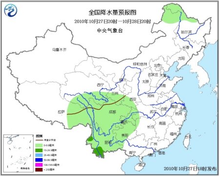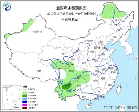 中新網(wǎng)10月27日電 據(jù)中央氣象臺預(yù)報,未來三天,新疆西部山區(qū)和北部、西藏東部、青海南部、甘肅南部、川西高原北部、內(nèi)蒙古東北部、黑龍江北部等地有小雨(雪)或雨夾雪。陜西南部、西南地區(qū)大部、湖北西南部、湖南西北部等地有小到中雨。