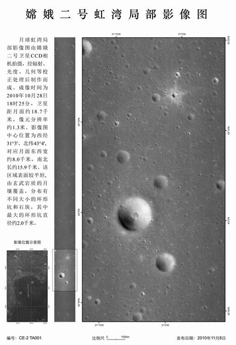 據(jù)中央電視臺報道,首次公布的月球虹灣地區(qū)局部影像圖是一張黑白照片。據(jù)國防科技工業(yè)局有關負責人介紹,該影像成像時間為10月28日18時,是衛(wèi)星距離月面大約18.7公里地方拍攝獲取。影像圖的傳回,標志著嫦娥二號任務所確定的六個工程目標已經(jīng)全部實現(xiàn)。這意味著探月工程二期“嫦娥二號”工程任務取得圓滿成功。