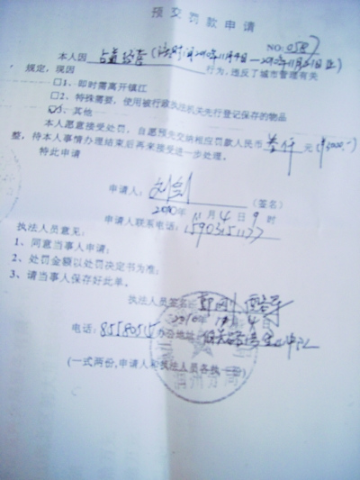記者現(xiàn)場(chǎng)調(diào)查采訪時(shí),發(fā)現(xiàn)大多攤主的手中,除了攤位費(fèi)收款收據(jù)外,還有一張由“鎮(zhèn)江市城市管理行政執(zhí)法局潤(rùn)州分局”印制的“預(yù)交罰款申請(qǐng)”單復(fù)印件,申請(qǐng)人是組織者劉某。內(nèi)容是“本人因占道經(jīng)營(yíng)行為,違反了城市管理有關(guān)規(guī)定,本人愿意接受處罰,自愿預(yù)先繳納相應(yīng)罰款人民幣叁仟元整,待本人事情辦理結(jié)束后再來(lái)接受進(jìn)一步處理”。