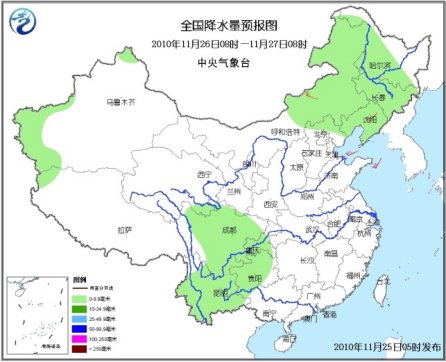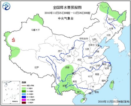 25日08時至26日08時,新疆北部和西南部局部、西藏西部、黑龍江北部和東部等地有小雪(雨)或雨夾雪;四川中南部、云南大部、貴州西部、廣西西部和南部、海南西部以及臺灣等地有小雨或陣雨。東北北部等地有4~5級偏北風(fēng),東南部沿海有5~7級風(fēng);南疆盆地西部有揚沙或浮塵天氣。。