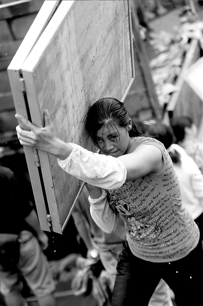 羅炳輝將軍廣場是彝良最大的災(zāi)民安置點(diǎn)之一,2000名受災(zāi)群眾集中安置在百余個帳篷內(nèi)。50多歲的毛振強(qiáng)和老伴帶著兩個孫子一起住在帳篷里。前天夜間,他和安置點(diǎn)的其他人一樣,被大風(fēng)和暴雨擾得睡不著覺。昨天凌晨1點(diǎn)左右,廣場上開始積水,很快水就漫過薄薄的紙板,被褥衣物都洇濕了!拔覀冓s緊把東西收拾起來,就這么站了一夜沒能睡覺!庇捎趲づ駜(nèi)物品進(jìn)水,昨天白天,安置點(diǎn)內(nèi)的很多災(zāi)民連坐的地方都沒有,蹲在地上吃飯,也沒法睡覺。