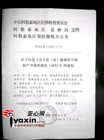 阿勒泰地區(qū)官員的財(cái)產(chǎn)申報(bào)制度,始于去年5月的一份《縣(處)級(jí)領(lǐng)導(dǎo)干部財(cái)產(chǎn)申報(bào)的規(guī)定(試行)》(下稱《規(guī)定》)。這份文件的起草人和主推者即吳偉平。