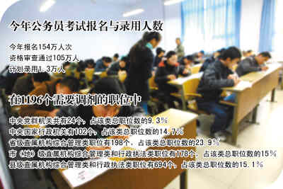 在7555個職位中,共有1196個職位沒有合格人選,或者合格人選未達(dá)到規(guī)定面試比例,其中有586個職位報考人數(shù)本身就未達(dá)到規(guī)定的面試比例,甚至無人報考。主管部門分析發(fā)現(xiàn),這些職位主要是艱苦、邊遠(yuǎn)、基層職位和專業(yè)特殊的職位,也有部分職位是由于設(shè)置不合理的資格條件,導(dǎo)致報考人員和過線人員較少。