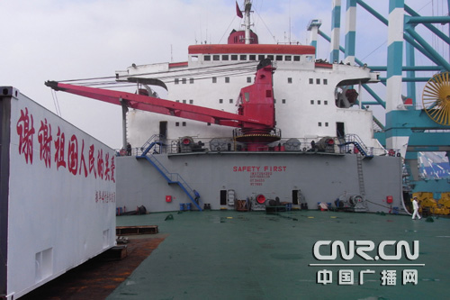 此時(shí),甲板中央一堵白色鋼板墻上,寫(xiě)著“謝謝祖國(guó)人民的關(guān)愛(ài)”幾個(gè)紅色大字。船員吳民祥說(shuō)這是在成功擊退索巴里海盜后,船員們?cè)诜岛酵局,利用海上難得的好天氣,先刷上白漆,再一一寫(xiě)出來(lái)的。