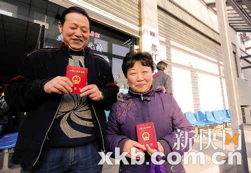昨天早上10時(shí),陽光明媚,重新拿到結(jié)婚證的譚興茂夫婦走出了辦證大廳!拔覀円郧暗慕Y(jié)婚證是張獎(jiǎng)狀,好像是國家對(duì)我們愛情的表揚(yáng)!弊T興茂拿著小紅本本對(duì)記者說。不過對(duì)于新版的結(jié)婚證,譚興茂的妻子趙樹清很興奮,她非常幽默地說:“60多歲了,就當(dāng)又結(jié)了一次婚,可惜老頭子還是那個(gè)人……”即使如此,譚興茂還是打算回去再擺一次酒。“即使有來生,我還是會(huì)娶她的!弊T興茂說。