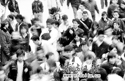 來自柳州的劉先生昨天搭乘K301次列車抵達廣州,他帶著老家的特產(chǎn)———烤鴨、雞、花生,打算送給在清遠鞋廠打工的工友和在廣東的老鄉(xiāng)。陜西寶雞人包永江前年因為一次意外的車禍致殘。昨天他拄著一雙拐杖,在廣州火車東站和諧號出站口等妻子。這是他第一次外出,因為妻子在自己打工的那家紡織廠里給他介紹了一份看門的工作,他從大年二十八就踏上了南下列車。為了省80元路費,他選擇先從寶雞轉(zhuǎn)到漢口,再從漢口乘慢車抵達廣州。因為妻子在黃金周長假期間加班,昨天下午才能從深圳趕過來接他。至昨天,他已經(jīng)連續(xù)在車站等了6天。他希望新年里,自己能為妻子分擔一些負擔,兩個人今年可以還清家里的欠帳。