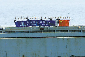 下午2點(diǎn)30分許,兩艘脫離危險(xiǎn)的中國商船與“武漢”艦在亞丁灣某海域會合。此后,他們將在“武漢”艦的伴隨護(hù)航下,安全駛向下一個目的地港口。經(jīng)歷了凌晨的驚心動魄,在茫茫無垠的大海上見到自己祖國的軍艦,兩艘商船上的船員再也掩飾不住興奮和喜悅!吧徎ê!碧柎瑔T放起了鞭炮,“樂民”號船員高舉鮮紅的五星紅旗,并打出了“中遠(yuǎn)航運(yùn)歡迎您!”表達(dá)他們對祖國海軍的真摯謝意。(田源 錢曉虎)