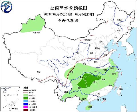 中央氣象臺2009年2月3日06時發(fā)布未來三天天氣預(yù)報: