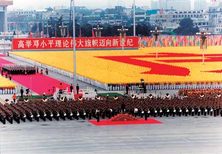 在開國大典那一天,這支年輕的軍樂隊用大部分從敵人手中繳獲的樂器(當(dāng)天甚至連圓號都沒有),演奏了《東方紅》、《義勇軍進行曲》、《中國人民解放軍進行曲》、《騎兵進行曲》、《青年進行曲》等充滿民族色彩的樂曲,他們連續(xù)站立演奏了近4個小時,直到群眾游行結(jié)束。