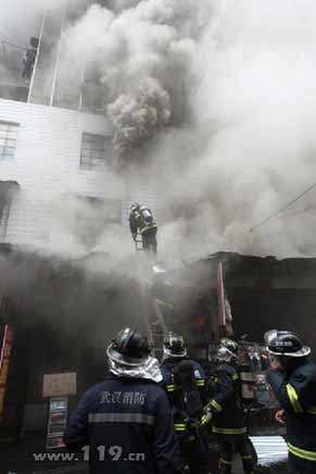當(dāng)日上午9時(shí)51分,武漢市119指揮中心接到火災(zāi)報(bào)警后,立即調(diào)集21個(gè)消防中隊(duì)、79臺消防車、322名消防官兵趕赴現(xiàn)場進(jìn)行撲救。發(fā)生火災(zāi)的華貿(mào)商城為一幢9層商住樓,一樓為經(jīng)營門面、2樓和3樓為倉庫,4樓以上為居民住宅。