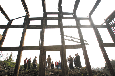 昨天上午,在劉伯承元帥的侄孫劉武青陪伴下,開縣近20名父老在舊居前緬懷劉帥。記者在現(xiàn)場看到,舊居左邊一間屋子的兩層樓全部被拆成光架架,幾根碗口粗的圓木和幾段斷壁殘垣孤零零地竦立在荒郊之中。右邊二樓的木質(zhì)窗戶早已殘缺不全,樓下具有巴渝民間建筑特色的雕花窗格,也遭到盜賊光顧,部分用竹篾條加石灰制作的墻面,在風吹雨打中也早已斑駁脫落。