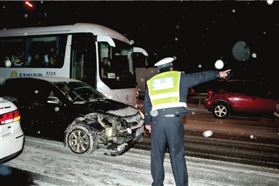 昨天,(北京)市交管局于清晨6點和晚高峰時分別啟動三級雪天疏導(dǎo)方案,加派3000名警力上路維護疏導(dǎo)。由于路面濕滑車速變慢,事故有所增多,傍晚雪情使晚高峰時間有所延長。昨晚8點開始,京津塘、京津第二高速、京沈高速先后被封閉。
