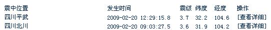 據(jù)地震臺網(wǎng)測定,北京時(shí)間2009-02-20 12:29:15.8在四川平武(北緯32.2,東經(jīng)104.6)發(fā)生3.7級地震。