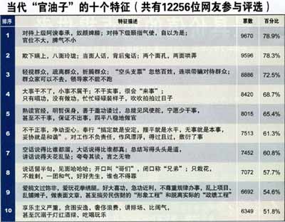 第三個(gè)階段:網(wǎng)絡(luò)調(diào)查。自2009年2月1日—2月12日,“官油子具備哪些特征”的專題調(diào)查(分為18條“官油子”特征評(píng)選和公眾對(duì)“官油子”的態(tài)度調(diào)查兩個(gè)部分)在人民網(wǎng)、新浪網(wǎng)、騰訊網(wǎng)、人民論壇網(wǎng)等網(wǎng)絡(luò)上推出。為什么選擇這幾家網(wǎng)站?因各網(wǎng)站的主要受眾群體不同,如人民網(wǎng)主要面向黨政干部,新浪網(wǎng)、騰訊網(wǎng)等為商業(yè)性網(wǎng)站,受眾面更廣,如此能夠體現(xiàn)更加廣泛地參與性,以使調(diào)查更具代表性。網(wǎng)絡(luò)調(diào)查推出短短十幾天的時(shí)間,即受到了廣大網(wǎng)友的熱情參與,共有12256人參與。在廣大網(wǎng)友的共同參與下,我們按照得票數(shù)的多少,列出了“官油子”的十種特征。
