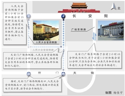 據(jù)介紹,在每次開會、散會前,天安門廣場西側(cè)路、人民大會堂南側(cè)路及人民大會堂西側(cè)路將分別采取交通管理措施,禁止各種車輛和行人通行。屆時(shí),天安門廣場西側(cè)路北口、人民大會堂西側(cè)路北口、前門西站、供電局路口將設(shè)置電子顯示屏,誘導(dǎo)社會車輛繞行。