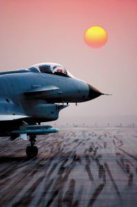 傍晚,落日的余暉為大地披上了一抹金紅色,一架架殲-10戰(zhàn)機在晚霞的光暈中翩然著陸。(賁道春 閆國有 本報記者 喬天富攝影報道)