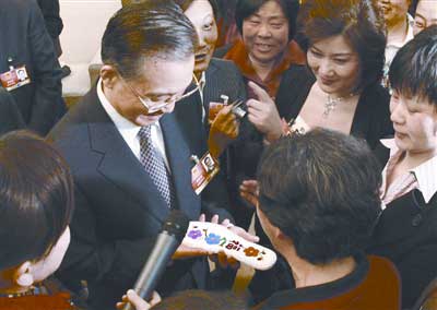 “謝謝,謝謝,謝謝!”昨11時(shí)許,中共中央政治局常委、國務(wù)院總理溫家寶參加完十一屆全國人大二次會議湖北團(tuán)的討論后,英山縣溫泉鎮(zhèn)百丈河村黨支部書記王金初趕到總理面前,遞上從包里取出的特殊禮物——一雙老鄉(xiāng)親手縫制的鞋墊,聽完王金初講述鞋墊的來由,溫總理連道三聲謝謝。