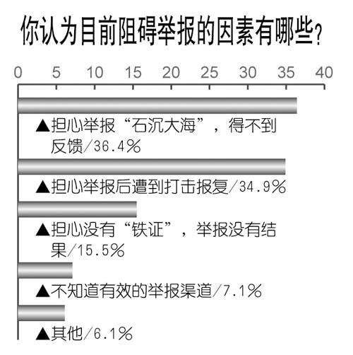 調(diào)查中,公眾給出的阻礙舉報的因素排序依次為:擔(dān)心舉報“石沉大海”,得不到反饋(36.4%);擔(dān)心舉報后遭到打擊報復(fù)(34.9%);擔(dān)心沒有“鐵證”,舉報沒有結(jié)果(15.5%);不知道有效的舉報渠道(7.1%)。